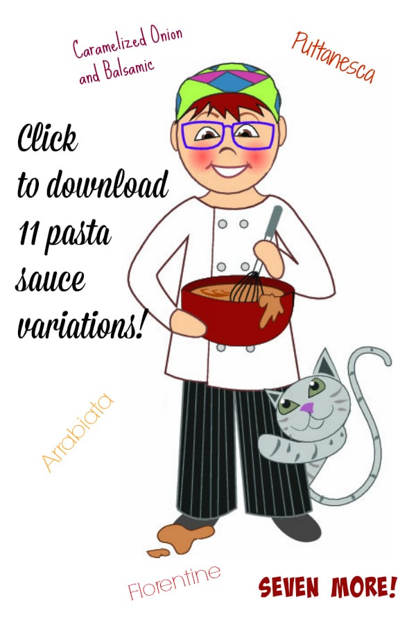 As promised, here’s a downloadable list of eleven ways to change up a regular jar of pasta sauce. Keep this list handy, because you just never know. You can also use these variations with your own favorite “plain” pasta sauce recipe.