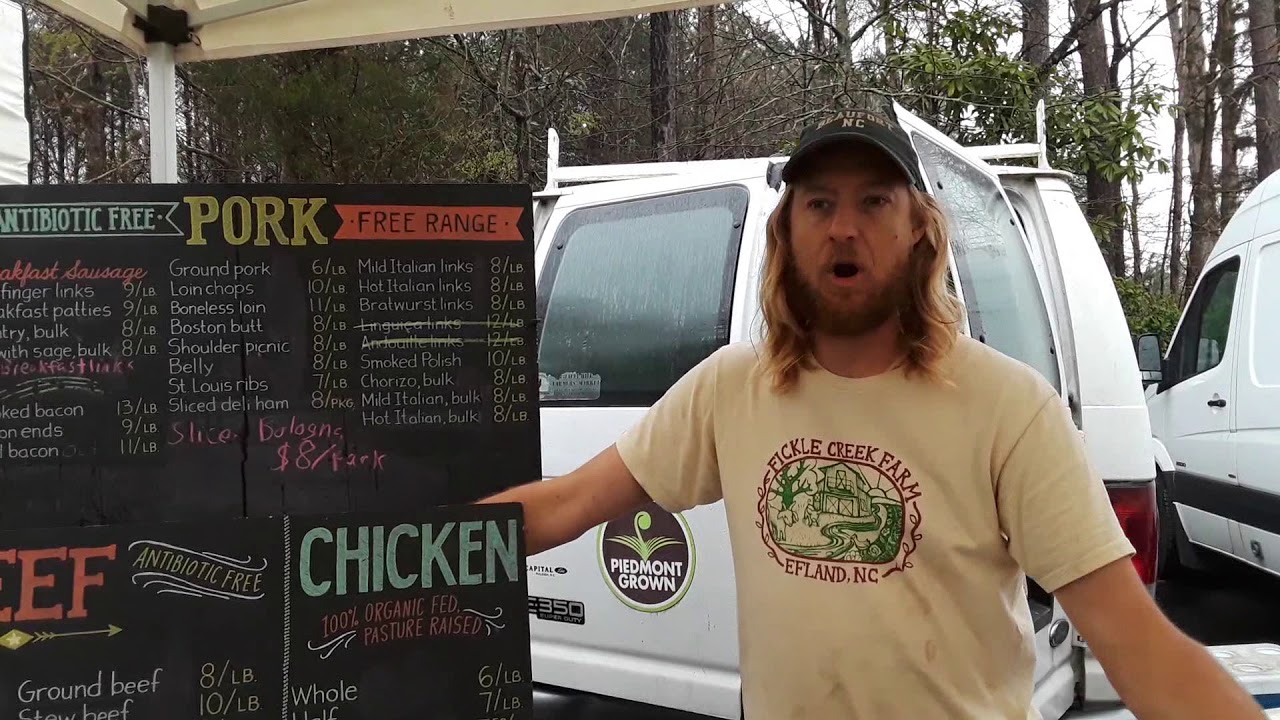 I had the pleasure of meeting Bryan Horton from Fickle Creek Farm at the Western Wake Farmers’ Market on the first Saturday of the Spring market to hear about their meat and to buy some for today’s recipe. Here’s the video I shot, and then read on for some fun facts about the farm!
